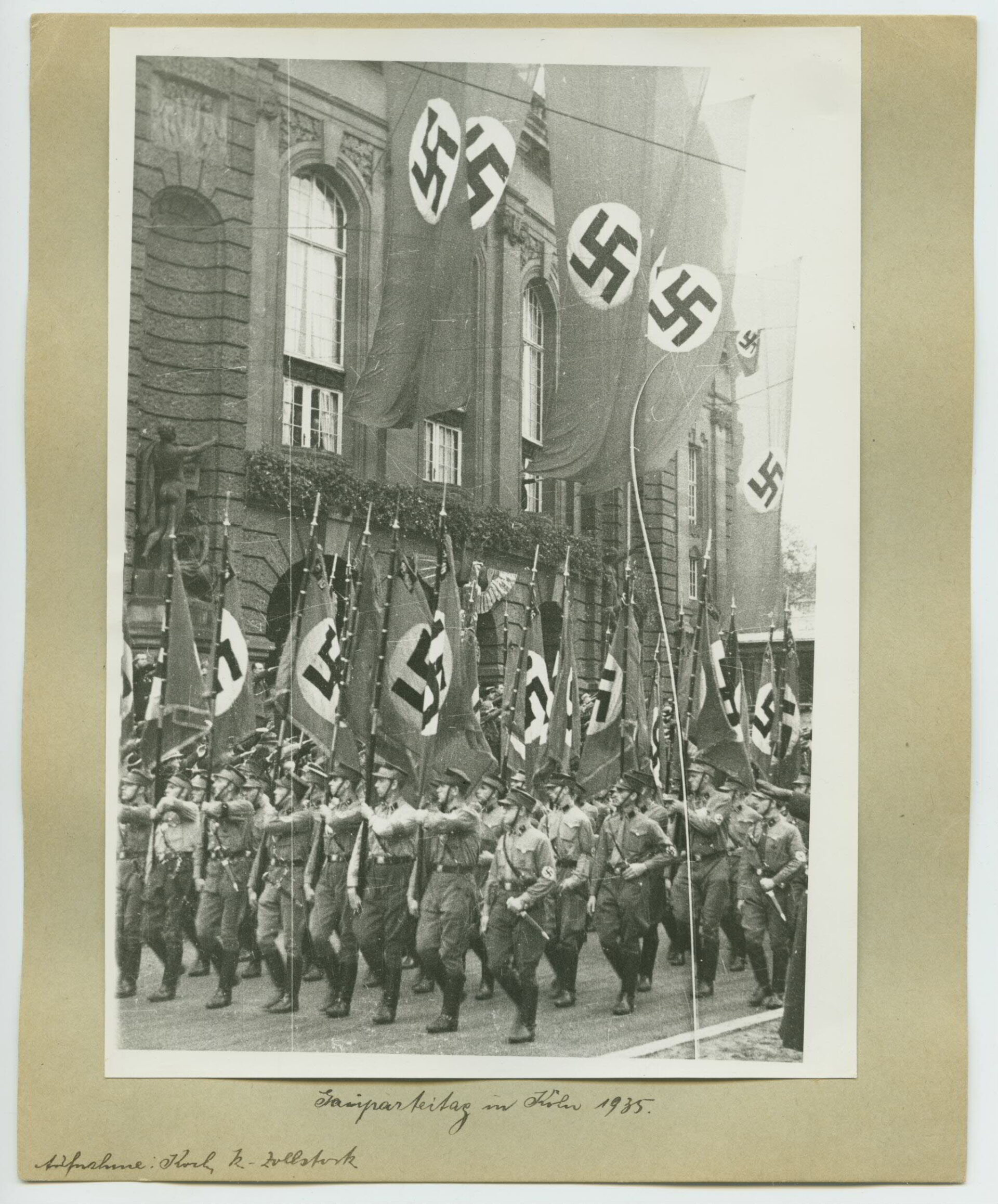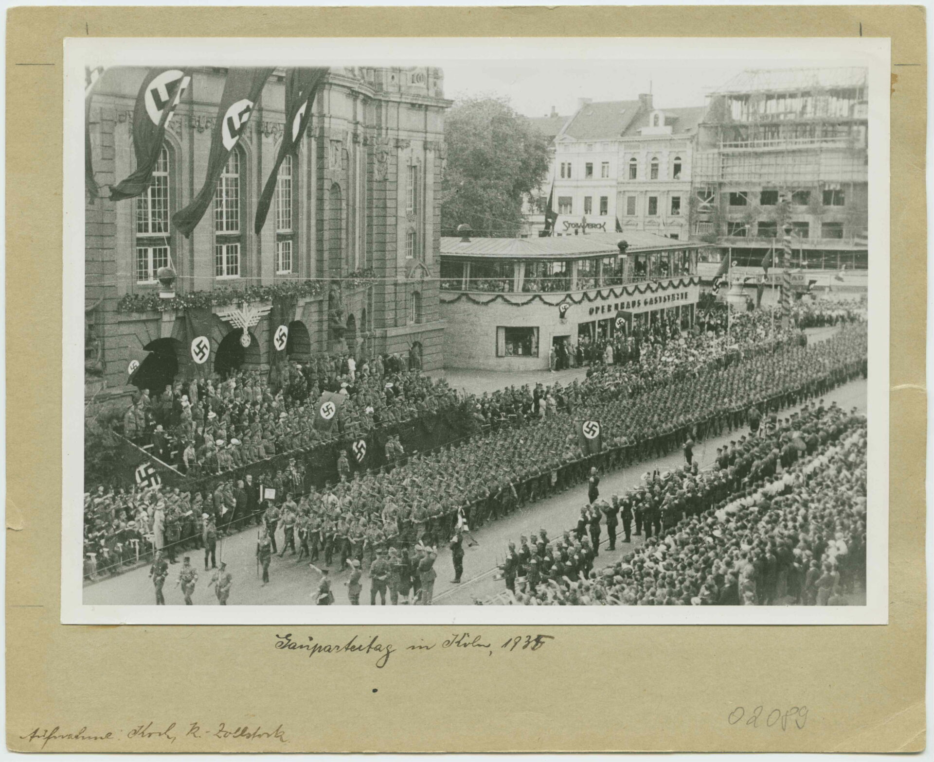 1: Raumansicht © privat; 2. Parade vor der Oper anlässlich des NSDAP-Kreistags in Köln am 4. August 1935 © NS-DOK; 3. Aufmarsch der SA in Nürnberg, 1934 © Bundesarchiv, Bild 183-K0326-0503-003 / CC-BY-SA 3.0; 4. Aufmarsch Kreis V Berlin 1936 © Bundesarchiv, Bild 183-2004-0812-500 / CC-BY-SA 3.0; 5. Reichsparteitag 1934 © Bundesarchiv, Bild 183-2004-0312-504 / CC-BY-SA 3.0; 6. Totenehrung beim Reichsparteitag 1934 © Bundesarchiv, Bild 102-04062A / Georg Pahl / CC-BY-SA 3.0; 7. Kundgebung im Berliner Lustgarten 1936 © Bundesarchiv, B 145 Bild-P022058 / CC-BY-SA 3.0; 8.-10. Parade vor der Oper anlässlich des NSDAP-Kreistags in Köln am 4. August 1935 © NS-DOK; 11. Ausstellungsansicht NS-DOK © Rheinisches Bildarchiv, rba_d003249; 12. Kreistag der NSDAP am 4. August 1935 © NS-DOK Bp 7143; 13. Abzeichen Kreistag 1935 in Köln © privat; 14. Westdeutscher Beobachter, 02.08.1935; 15. Westdeutscher Beobachter, 04.08.1935; 16. Parade vor der Oper anlässlich des NSDAP-Kreistags in Köln, 04.08.1935 © NS-DOK; 17. Altes Opernhaus am Rudolfplatz 1934 © NS-DOK; 18. Ausstellungsansicht Dokumentation Obersalzberg © Dokumentation Obersalzberg / Kradisch; 19. Ausstellungsansicht NS-DOK © privat; 20. Ausstellungsansicht Kölnisches Stadtmuseum © privat; 21. Ausstellungsansicht in der KZ-Gedenkstätte Buchenwald © Claus Bach, Sammlung Gedenkstätte Buchenwald; 22. Ausstellungsansicht im Kreismuseum Wewelsburg © Kreismuseum Wewelsburg / Fotografin: Lina Los; 23. Ausstellungsansicht im Dokumentationszentrum Reichsparteitagsgelände © Stefan Meyer / Dokumentationszentrum Reichsparteitagegelände