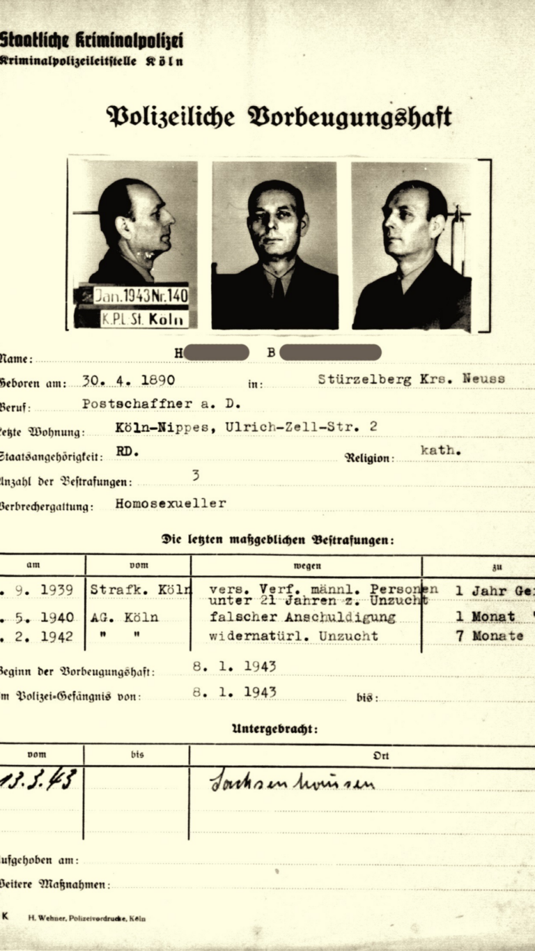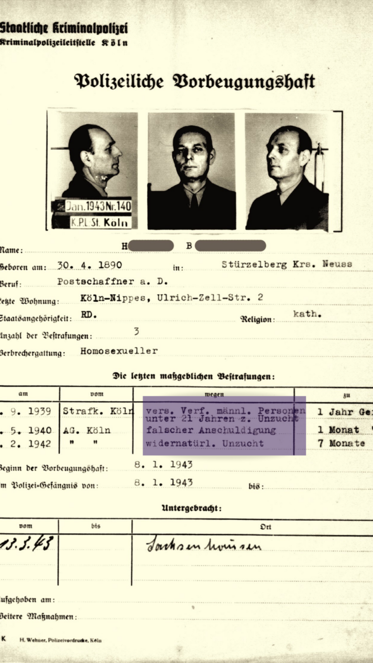 Vom Kölner Landgericht wurde der Postangestellte H.B. deshalb wegen »widernatürlicher Unzucht« und der »versuchten Verführung männlicher Personen unter 21 Jahren zu Unzucht« verurteilt – Straftatbestände, die das NS-Regime für die Verfolgung von Homosexuellen genutzt hat (§175, 175a StGB). Später folgten weitere Verurteilungen.