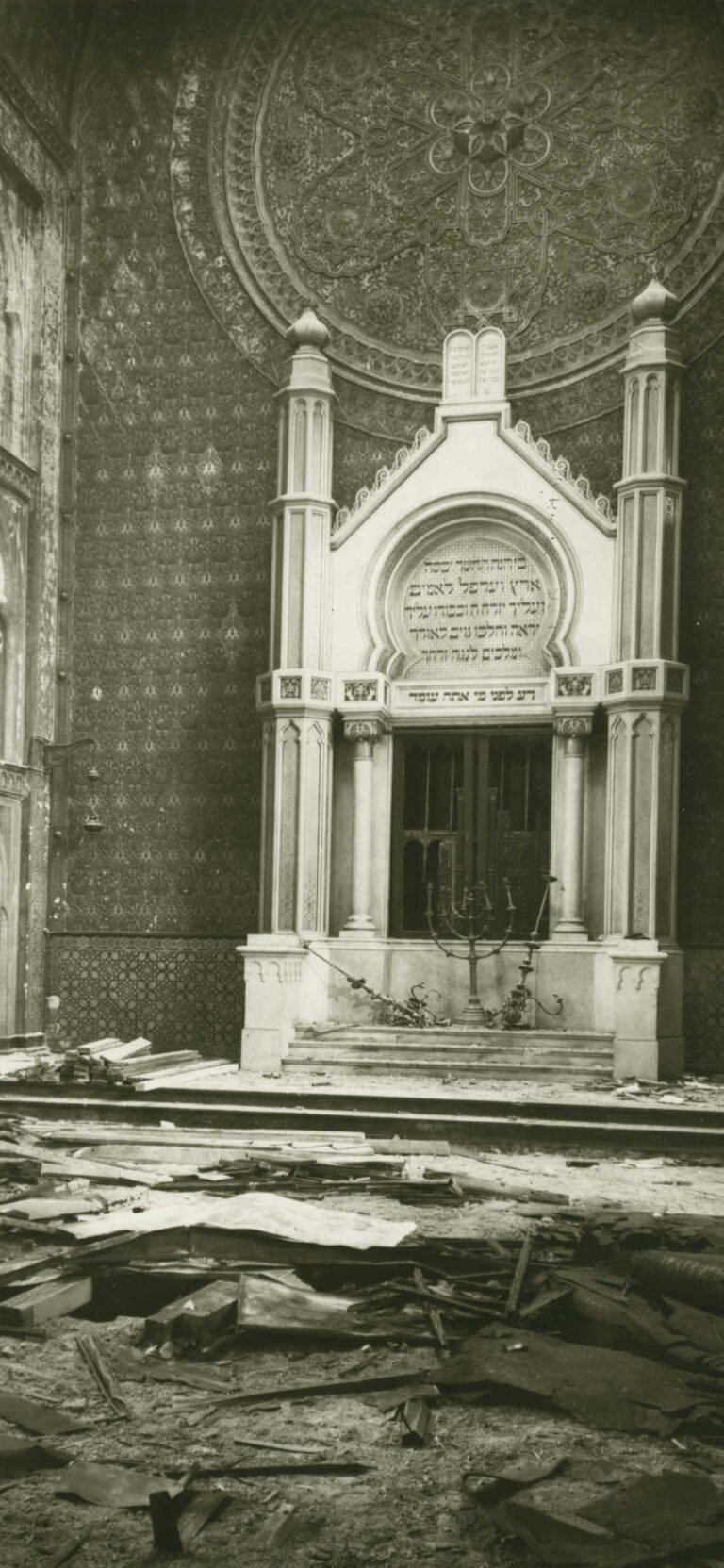 In den Tagen um den 9. November 1938 wurden reichsweit jüdische Gotteshäuser, Friedhöfe, Geschäfte und Wohnungen zerstört, mehrere hundert Jüdinnen und Juden ermordet. Während und nach dieser »Reichspogromnacht« war es die Gestapo, die die Ausschreitungen beaufsichtigte, Hunderte jüdische Kölner in das KZ Dachau verschleppte und den Besitz der jüdischen Gemeinden beschlagnahmte, wie hier in der Synagoge in der Glockengasse.