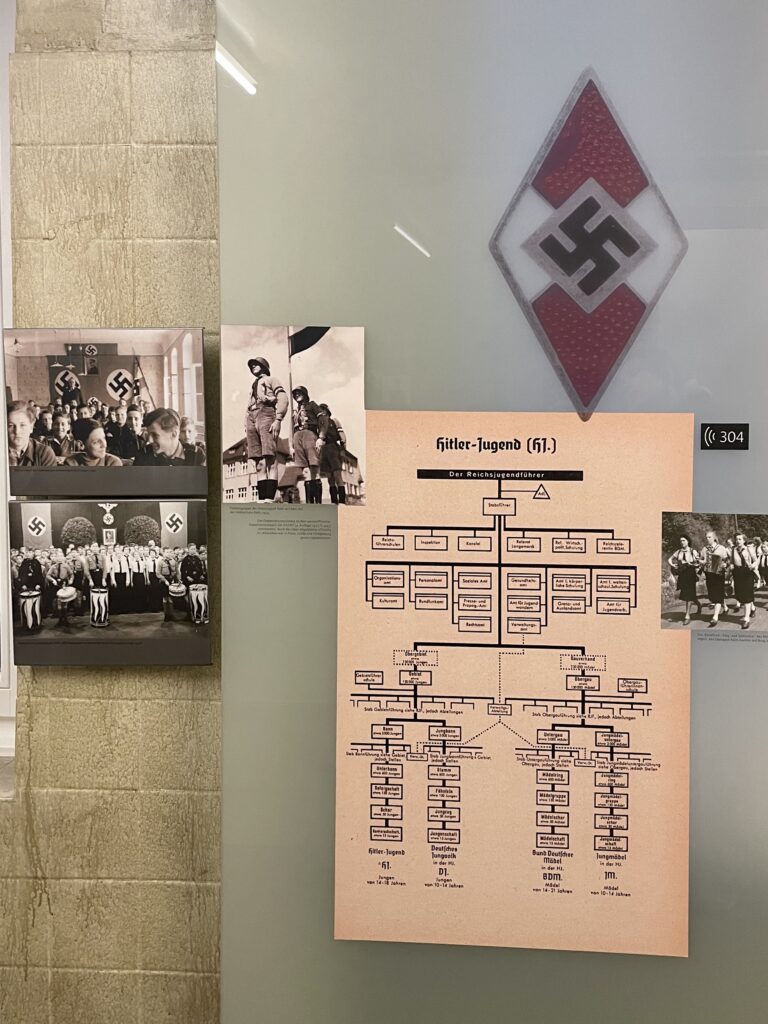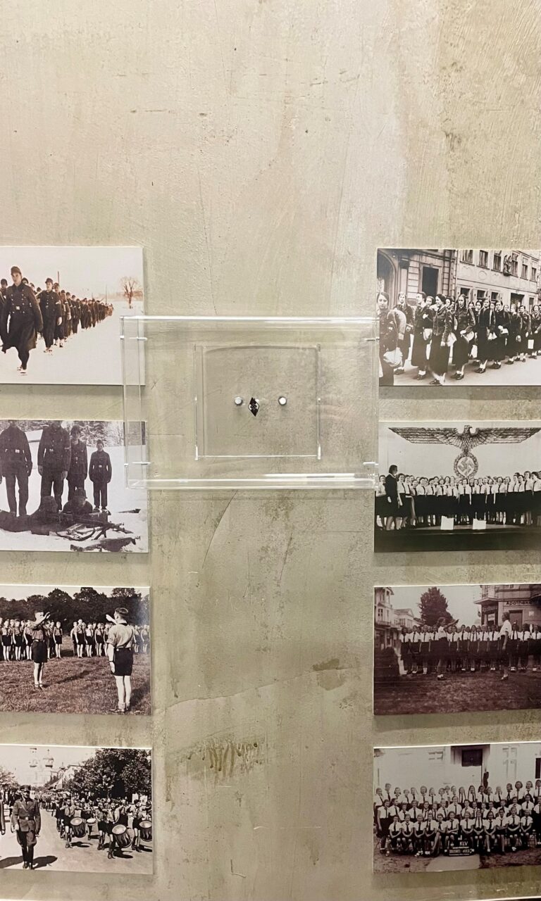 Das HJ-Abzeichen wie hier einfach nur stark vergrößert als Bild zu zeigen und als Kulisse für andere Exponate zu behandeln, macht die Objektgeschichte unsichtbar. Die Präsentation läuft zudem Gefahr, eine ohnehin verbreitete Faszination für nationalsozialistische Symbole zu bedienen.